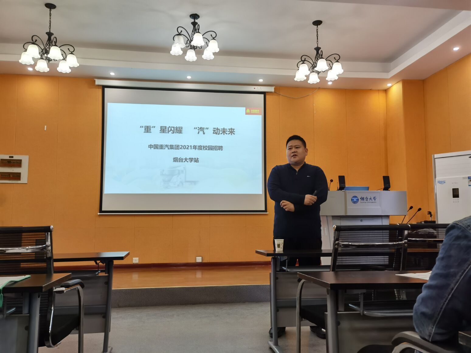 开展招聘会,秋招时该公司就成功吸纳了数十名应届毕业生。此次招聘宣讲会旨在扩招应届毕业生,吸收更多人才。本次招聘会分为三个阶段:宣讲、分组面试和洽谈。通过PPT宣讲,何震向同学们介绍了中国重汽的企业历史、职业岗位组成、事业平台、人才管理体系、后勤服务以及入职培训等多方面信息,让同学们深入了解该公司的背景前途,以便求职学生根据自身具体情况选择参加面试。随后,何震向同学们分享了他在面试时遇到的趣事:简历忘写名字,各种毫不相关的工作经历等,有效缓解了招聘会的严肃气氛,带动了同学们的情绪。同时何震也特别强调了面试者的态度,他期望面试者要有朝气和积极向上的精神面貌。接着招聘会开始了面对面面试环节,有意愿的毕业生逐一介绍自己,参加面试。至此,此次招聘会圆满结束。