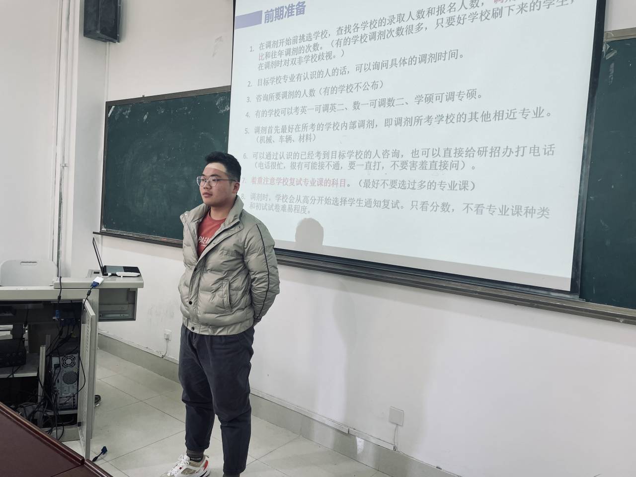 2021级研究生,他向在座的各位研究生建议:“行百里者半九十,复试之前的准备工作尤为重要,切不可松懈;听听过来人的建议,作为已经进入研究生行列的师兄师姐是值得引经据典的好地方。”同时,他还点出不要随波逐流,考研是一场一个人的战斗,要把握住自己的节奏,不要盲目跟随别人的节奏,尽人事,知天命。其中,他还向大家推荐了有助于大家进行调剂复试的几款App,并且再次提醒大家要放平心态,稳中求胜。随后,高建通学长分享了自己的心得体会和技巧方法。他将一些报考和复试各个阶段的细节问题一一罗列,重点强调了在座的同学应注意不要选择过多的专业课,不懂就去咨询。关于调剂的问题,高建通学长将调剂时各阶段的注意问题以及细节问题做了详细地说明,这无疑为在座的预备复试的学生打了一针镇定剂。接着,其他的几位学长也依次上台为大家进行经验的分享以及方法的传授。最后,主持人何彤宣布结束了本次交流会。