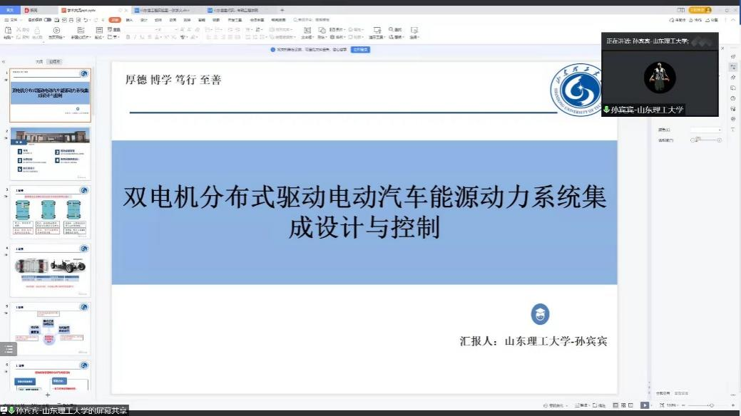 第二场学术报告是由山东理工大学孙宾宾副教授带来的“双电机分布式驱动电动汽车能源动力系集成设计与控制”。孙教授通过详实的技术背景介绍引出双电机分布式驱动在电动汽车能效优化上的创新设计方案,着重介绍了模式切换保证平顺性的解决方法和制动回馈策略优化设计,最后展示了其课题组在机电飞轮混动系统研发的最新成果。