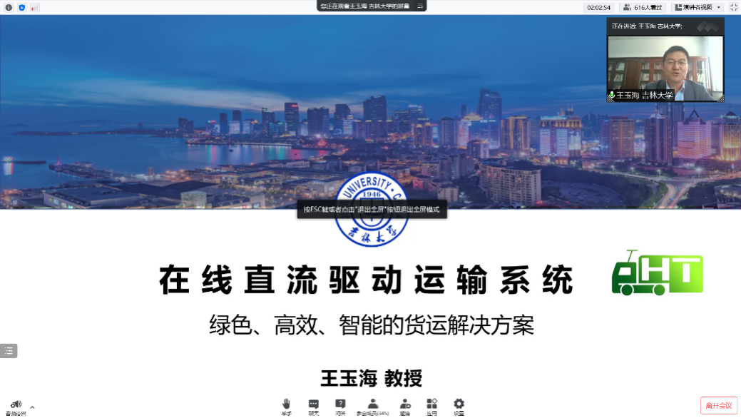 第四场学术报告是由吉林大学青岛汽车研究院院长王玉海教授带来的“在线直流驱动运输系统--绿色高效智能的货运解决方案”。王教授结合国内外货运最新技术发展提出了“在线直流驱动”绿色高效智能的货运解决方案,着重介绍了动力系统受电弓智能设计、物流集散解决思路和混动能耗优化方法,最后以济青高速公路为例,结合充分详实的数据分析,论证了其货运方案的绿色经济性。