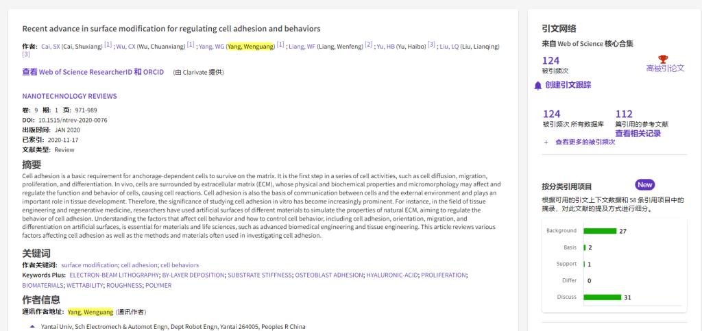 教师杨文广老师发表于《NANOTECHNOLOGY REVIEWS》的论文《Recent advance in surface modification for regulating cell adhesion and behaviors》入选ESI高被引论文。该论文以javbus
