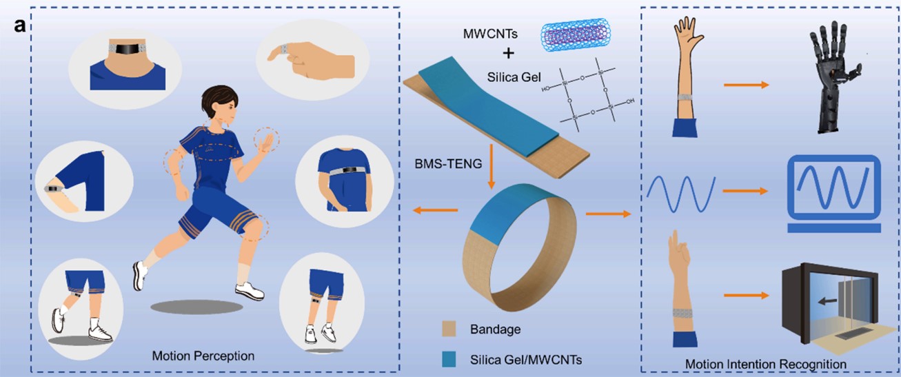 本论文提出了一种基于多壁碳纳米管(MWCNTs)、可拉伸硅胶和自粘弹性绷带制作的摩擦纳米发电机(BMS-TENG),该BMS-TENG具有自粘性,可以方便固定在人体任意位置。同时,BMS-TENG还具有良好的拉伸性能,最大能实现502%的拉伸率。其次,BMS-TENG可以收集各种人体运动和生理信号,如弯曲手指和肘部,抬腿,呼吸,吞咽等。另外,在机器学习的辅助下,提出了一种能够获取运动信号并识别运动意图的智能绷带系统。作为实际应用,智能绷带系统通过监测前臂肌肉收缩产生的信号,可以实时操纵机械手完成不同的手势以及进行个人身份识别。因此,该系统在人体运动监测、电子皮肤、人机交互、手势识别、生物医学等领域具有广阔的应用前景。