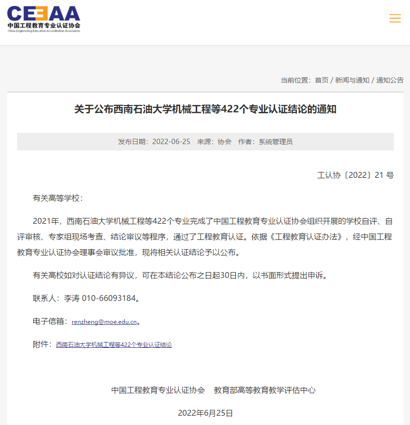 近日,教育部高等教育教学评估中心和中国工程教育专业认证协会正式发布了《关于公布西南石油大学机械工程等422个专业认证结论的通知》(工认协〔2022〕21号),对2021年度工程教育专业认证结论进行了公示。经过学校自评、自评审核、专家组现场考查、结论审议等程序,javbus
